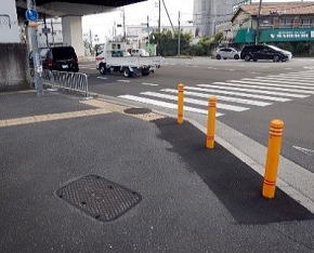 相談を受けた委員が当局に提報し、当局から道路を管理する大阪府(土木事務所)に連絡した結果、安全柵が再設置(写真奥)されたことに加え、相談者の要望を受け、新たに車止めポールが設置(写真手前)され、さらなる安全対策が講じられました。
